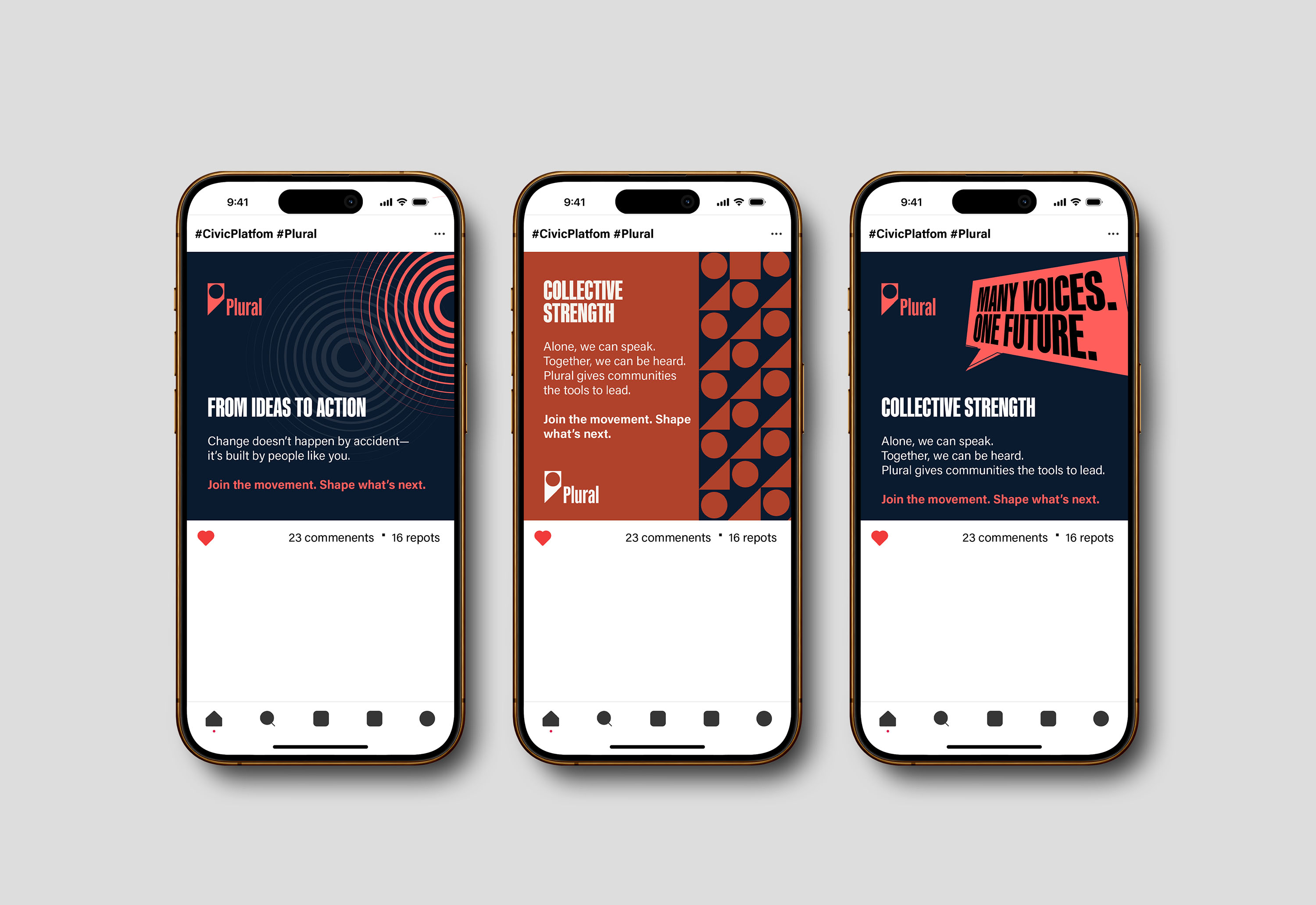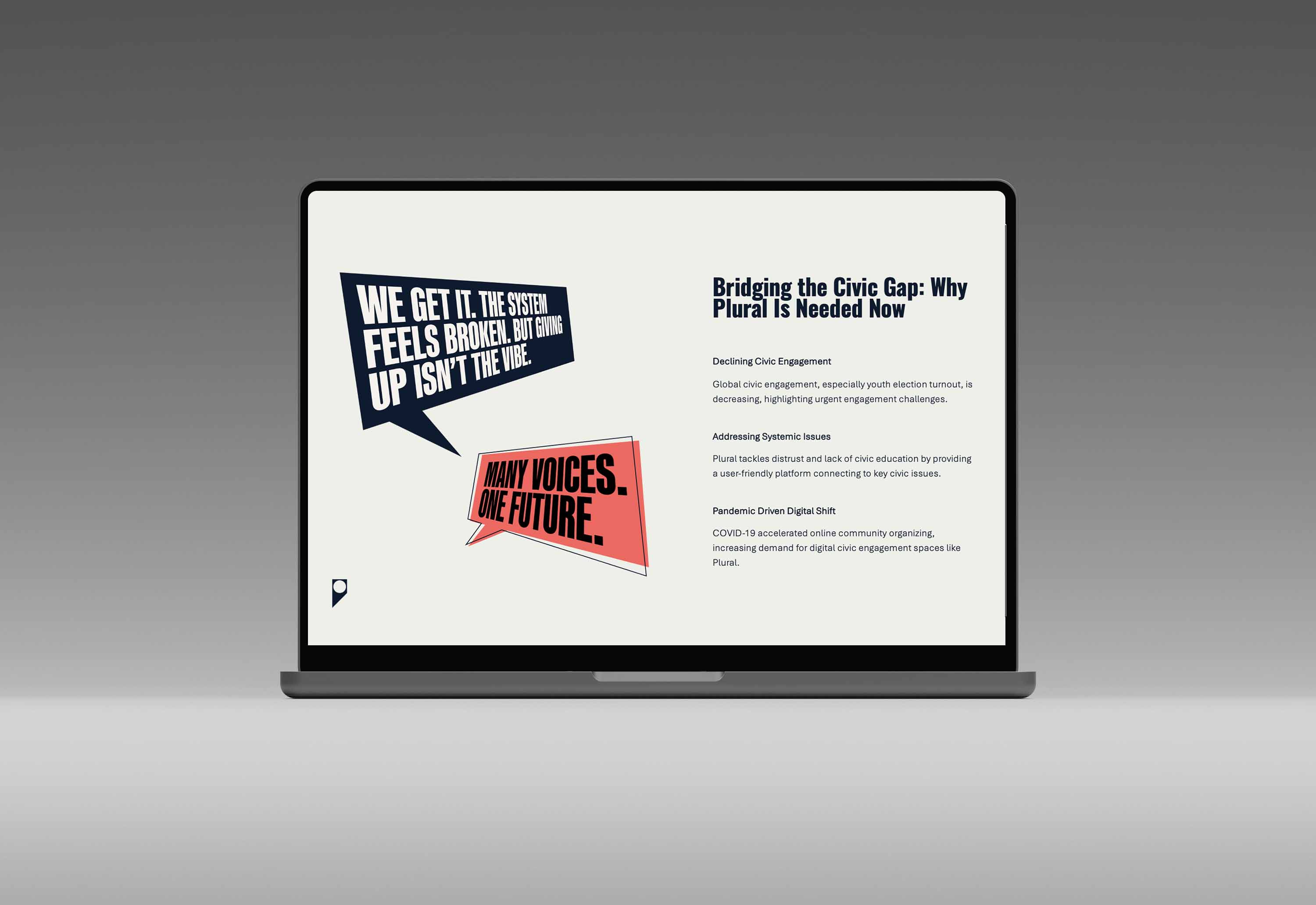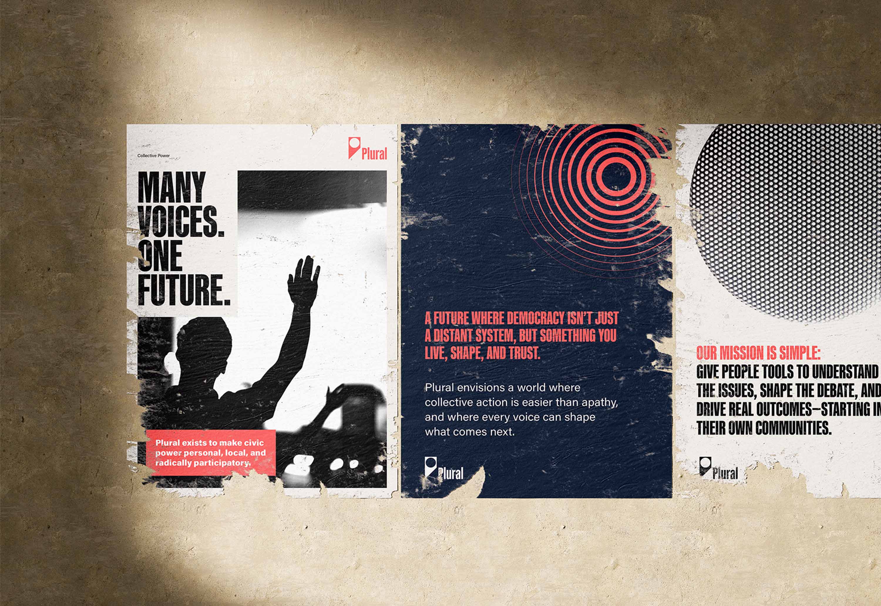 Plural began as a civic platform concept designed to make democratic participation more accessible, relatable, and collective for Gen Z. I defined the core idea—“many voices shaping one shared future”—which inspired the name and shaped a brand that feels like a fresh, authentic movement rather than a political institution. I built the visual and verbal identity around that mission.